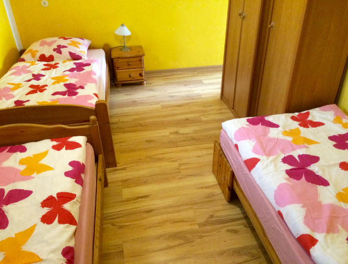 W jednym pokoju są trzy pojedyncze łóżka,a w salonie dodatkowo tapczan.