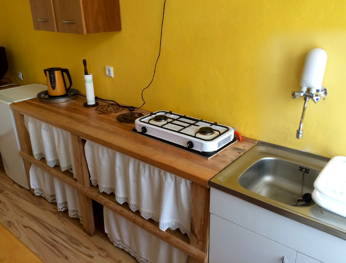 Do dyspozycji czysta łazienka, w pełni wyposażona kuchnia i koza (w sensie prawie kominek, gdyby ktoś myślał o zwierzątku).